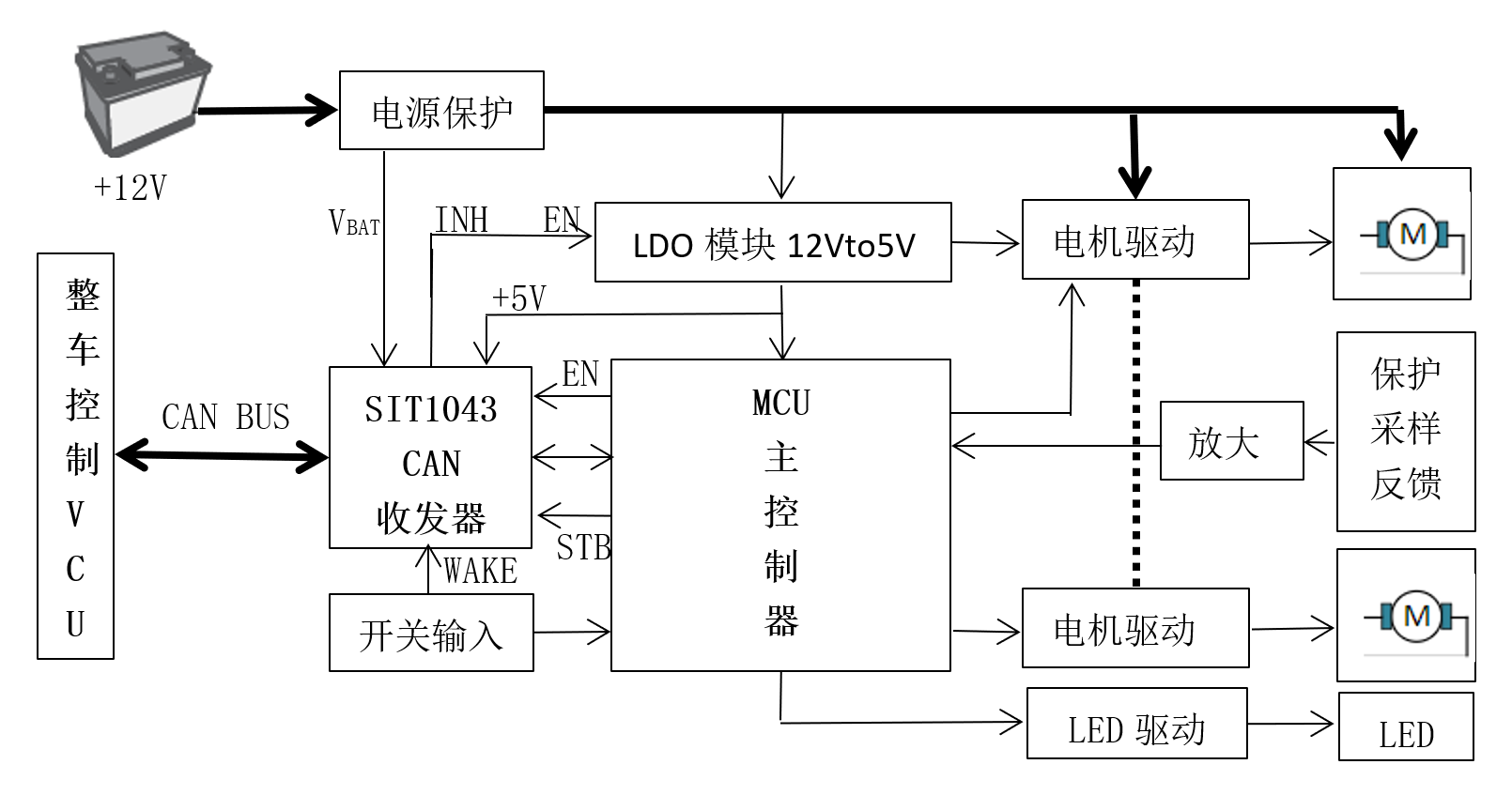 ECU最常见的有:EMS(Engine Mangement System)发动机管理系统,TCU(Transmision Control Unit)自动变速箱控制单元,BCM(Body Control Module)车身控制模块,ESP(Electronic Stability Program)车身电子稳定控制系统,BMS(Battery Management System)电池管理系统,VCU(Vehicle Control Unit)整车控制器等。随着ECU控制范围已经扩张到巡航控制、灯光控制 、安全气囊控制 ,悬架控制 、燃油加热控制、排气控制、制动控制、EGR和增压压力控制等等。下面u支付来介绍SIT1043Q在车门控制模块中的应用。在汽车车门模块设计中,其技术需求: