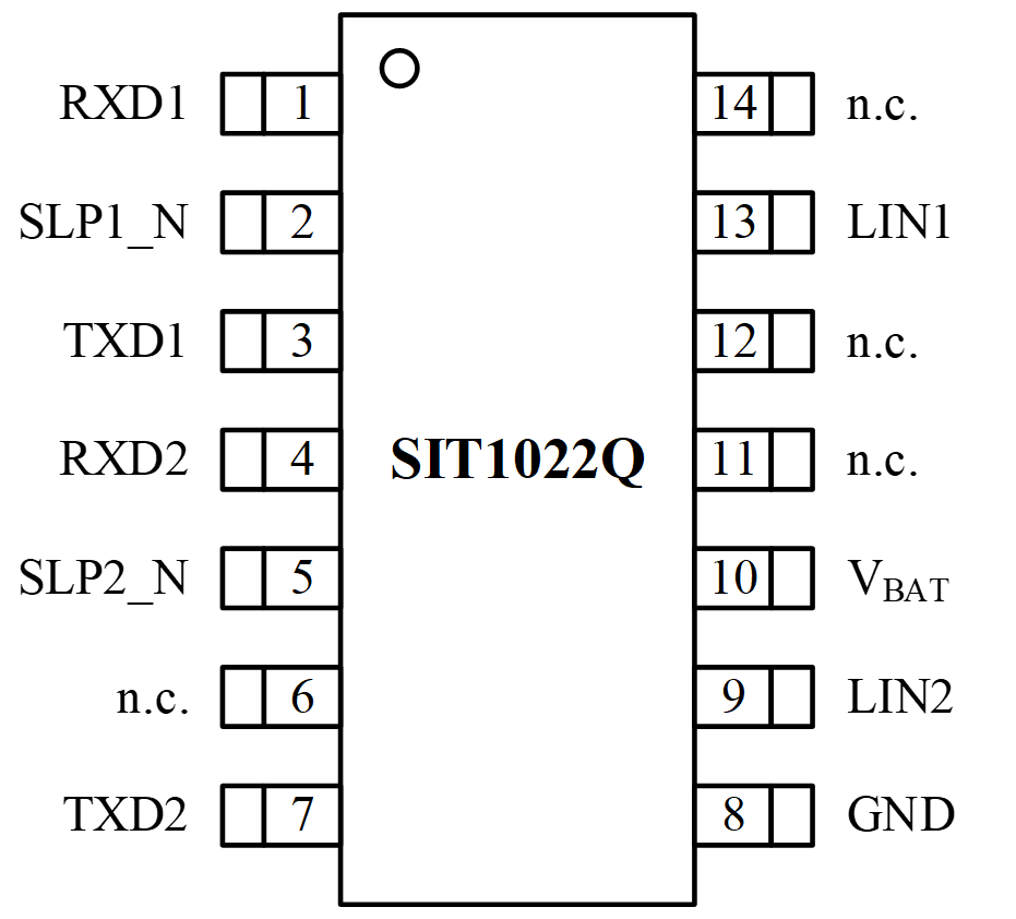 SIT1022Q是一款双通道本地互联网络(LIN)物理层收发器,符合LIN 2.0、LIN 2.1、LIN 2.2、LIN 2.2A、ISO 17987-4:2016 (12V) 和SAE J2602标准。主要适用于使用1kbps至20kbps传输速率的车载网络。SIT1022Q顺利获得TXDx引脚控制 LINx总线的状态,可将协议控制器的发送数据流转换为具有最佳压摆率和波形整形的总线信号,以最大程度地减少电磁辐射发射(EME)。LIN总线输出引脚具有内部上拉电阻,仅当用作主机节点时,才需将LIN总线端口顺利获得一个与二极管串联的外部电阻上拉至VBAT。SIT1022Q顺利获得LINx引脚接收总线上的数据流,并由接收器的输出引脚RXDx将数据传送到外部的微控制器。