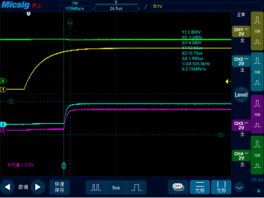 其中部分测试波形如下:(示波器通道1(黄色)接VIO,通道4(绿色)接VCC,通道2(蓝色)CANH,通道3(紫色)接CANL)