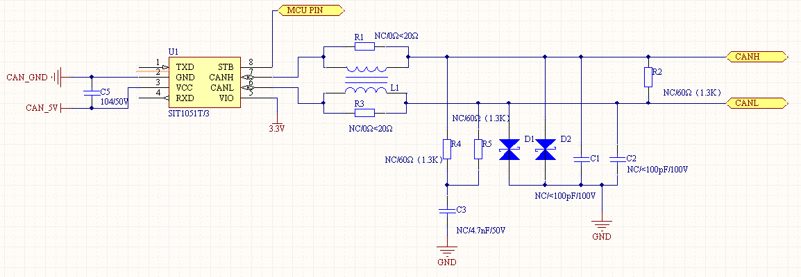 CANH 和 CANL 输出到 GND 的一对匹配电容用于提高抗电磁干扰的性能。相应噪声源的阻抗和 CANH 和 CANL 对地的电容组成了一个 RC 低通滤波器。电容值必须由节点的数量和数据传输频率决定。一般选取<100pF,如果外接 ESD 保护器件,该电容值可适当减小或省掉。图中串联电阻可调整与对地电容形成的低通滤波器性能,但电阻值不应过大,导致显性差分电压值降低明显。