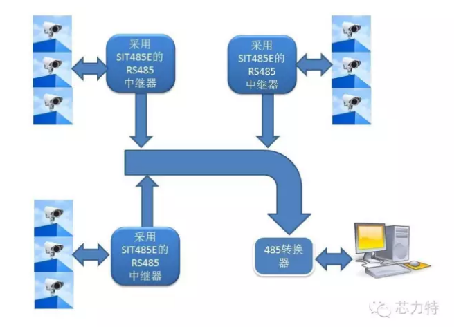 还有一些情况下,需要利用RS485构成层级管理网络,灵活利用485集线器,可以将总线型的拓扑结构连接成树型的拓扑结构,大大的方便了前期施工和后期的维修工作。